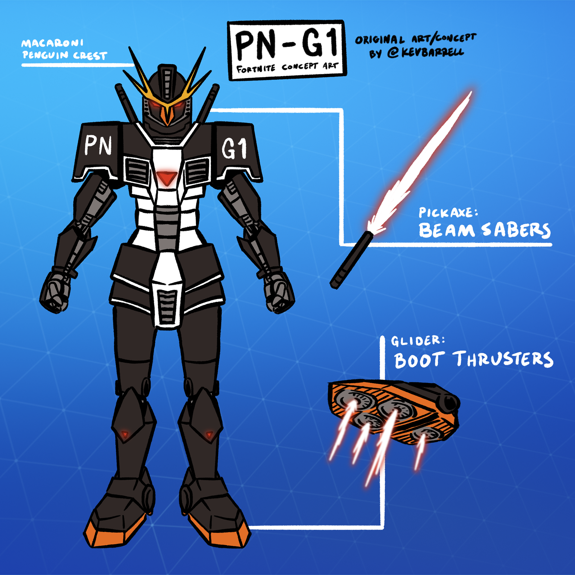Drawing inspiration from the distinctive macaroni penguin and the iconic Mobile Suit Gundam, I designed PN-G1, a robotic penguin-like character. PN-G1 (or PING-ONE) blends the whimsical nature of a macaroni penguin with the sleek, mechanical aesthetic of a Gundam. The character features a vibrant yellow crest, reminiscent of the macaroni penguin's feathers, combined with the robust armor and intricate details of a mobile suit. This fusion creates a playful yet formidable appearance, perfect for the dynamic world of Fortnite.